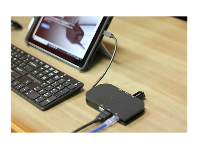 La station d'accueil SD1610P de Kensington a été conçue pour les appareils Microsoft Surface. Les utilisateurs peuvent ajouter à leur poste de travail mobile ou au bureau un écran VGA Full HD ou HDMI 4K et y connecter leurs accessoires USB préférés. Qu'elle soit installée dans un espace de travail temporaire ou une salle de conférence, la SD1610P assure l'énergie et la productivité des utilisateurs. Grâce à la technologie USB-C et à la transmission d'alimentation 3.0 (Power Delivery), les utilisateurs peuvent se connecter en toute confiance à leur appareil en comptant sur SD1610P pour étendre leur espace de travail, utiliser leurs accessoires préférés et alimenter leur appareil Surface en même temps*. *Chargeur USB-C 3 A/60 W (ou supérieur) requis (non fourni).