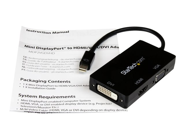 StarTech.com Adaptateur Mini DisplayPort 3 en 1 - 1080p - Répartiteur Mini DP / Thunderbolt vers HDMI / VGA / DVI pour Votre Moniteur (MDP2VGDVHD) - Adaptateur vidéo - Mini DisplayPort mâle pour HD-15 (VGA), DVI-D, HDMI femelle - 27 cm - noir - actif, support 1920 x 1200 (WUXGA) - pour P/N: DKT31CMDPHPD