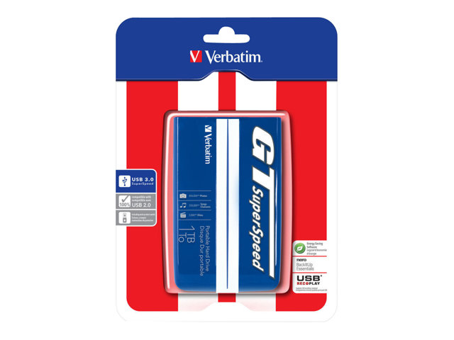 Verbatim GT SuperSpeed - Disque dur - 1 To - externe (portable) - 2.5" - USB 3.0 - blleu avec des bandes blanches 53083