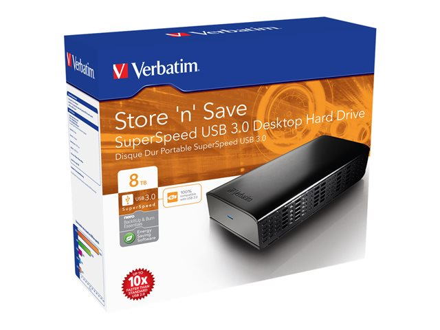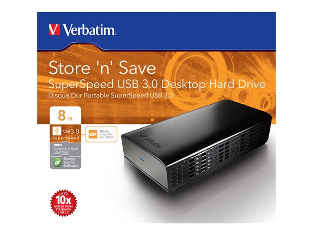 Le disque dur de bureau USB 3.0 Store 'n' Save de Verbatim est une solution de stockage hautes performances qui utilise une interface haute vitesse USB 3.0. La norme USB 3.0 permet d'atteindre des débits multipliés, vous offrant un taux de transfert de données ultra-rapide. Store 'n' Save peut être installé à plat ou sur le côté pour libérer davantage d'espace sur votre bureau.
