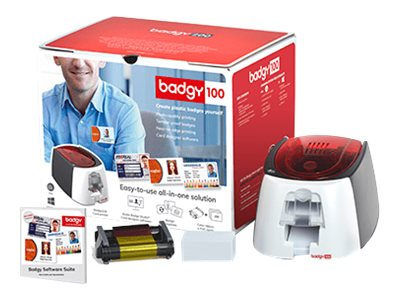 La Badgy100 est une solution tout en un qui vous permet d'imprimer à la demande vos badges et cartes personnalisées. Le pack inclut une imprimante, un logiciel de création de badge, un kit de démarrage composé d'un ruban et de 50 cartes vierges, et un site Internet dédié pour télécharger des modèles de badge.
