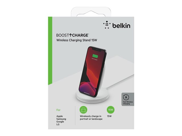 Belkin BOOST CHARGE - Plot de charge sans fil + adaptateur secteur - 15 Watt - blanc - pour Apple iPhone 11, 11 Pro, 11 Pro Max, 8, 8 Plus, X, XR, XS, XS Max; Samsung Galaxy Note10, Note10+, S10, S10+, S10e