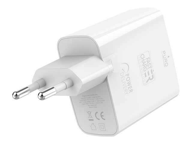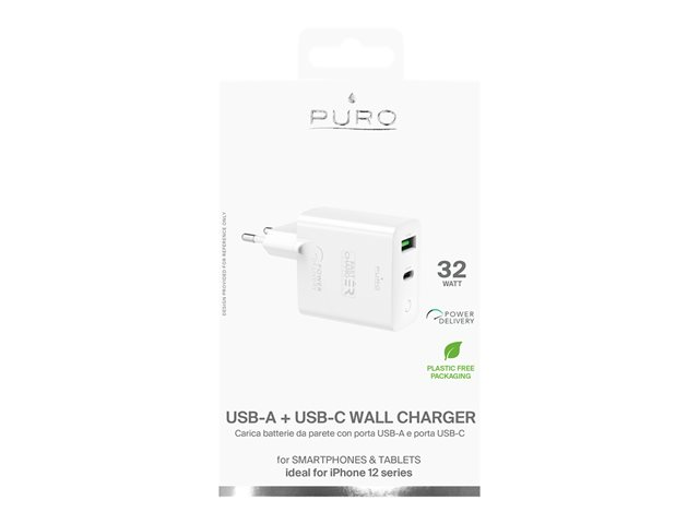 Puro - Adaptateur secteur - 32 Watt - 3 A - Fast Charge, PD - 2 connecteurs de sortie (USB, 24 pin USB-C) - blanc PUROCS32WUSBACWT